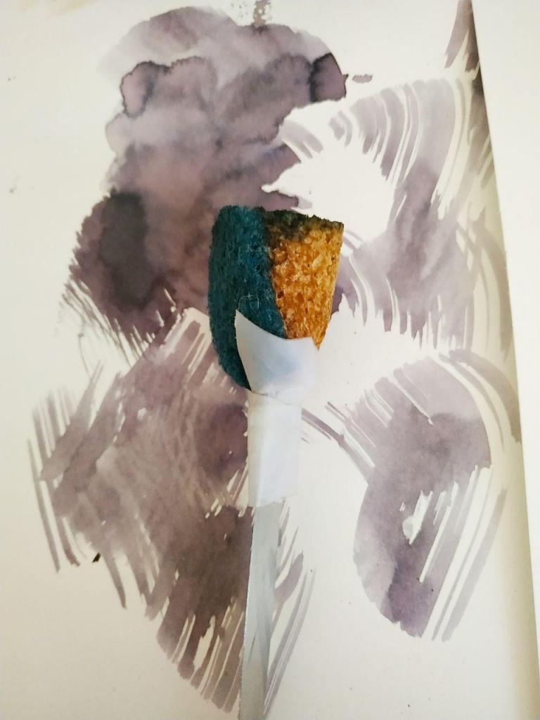 Trouvez dans cette image quel pinceau est fait d’un couteau auquel j’ai fixé un bout d’éponge Spontex avec le dernier morceau de scotch qui me restait).